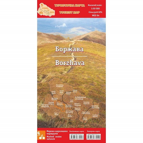 Туристична карта Боржаві. Більшість із представлених територій перевірена власними виходами в гори, які проводив фонд "Карпатські тропінки" (безпосередньо займається маркуванням пішохідних маршрутів і встановленням покажчиків на території Українських Карпат). Актуалізація картографічної основи 2012-2014 рр. Досліджено за допомогою навігатора та представлено на мапі ~ 600 км стежок і доріг. Крім основного масиву Боржава, на мапі показано також вихід від синовірського перевала маркованим маршрутом на гору Каменка, територія біля Ольщанського водосховища та виходи на гору Менчул, а також інші цікаві місця. На карті: - Cтий - Темнатик - Велыкый Верх - Гимба - Магура-Жиде - Лялька - хребет Палений Грунь - Скалянка - Ряпецька, водоспад Шипот - Тяпеш - Менчул - Мерша Особливості: - на мапі «Боржавіння» вперше нанесені лампонебезпечні схили Боржави - на мапі нанесені промарковані на місцевості та заплановані до позначення пішоходові маршрути - в районі пиліпця показані траси однойменного байк-парка й інформація про довжину трас, складності та перепади висот - карта містить телефони служб порятунку Характеристики: Масштаб карти: 1: 50 000 Сетка координат: WGS-84 Розмір карти: 690 х 480 мм Розмір у складеному вигляді: 115 х 240 мм Назви на мапі українською та англійською мовами (транслітерація) ISBN: 978-966-2623-47-5